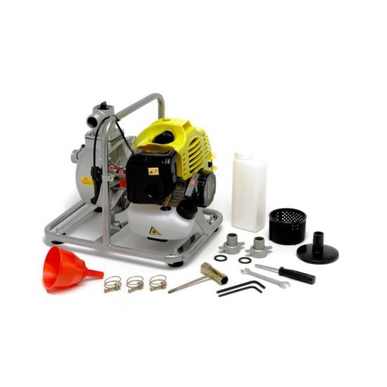 Données techniques Moteur 2-Temps 1E40F-5 Cylindrée: 42.7cm³ Sortie : 1.45kw, 2hp/6500 rpm Démarrage électronique Carburant: mélange essence/huile à 4% Hauteur d’aspiration: 8m Grosse Crépine d’aspiration munie de nombreux trous de 5mm . Diamètre d’entrée et de sortie: 1 inch / 25.4mm Hauteur d’eau maximum: 35m Débit 8m³/h Starter Manuel à tirette Bouton stop pour arrêter la pompe