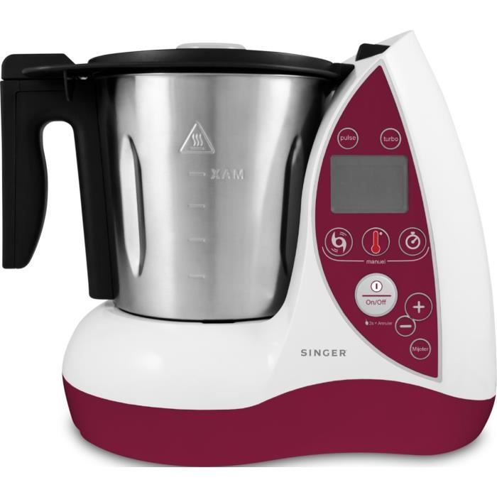 Caracteristiques generales . Type robot : Robot cuiseur . Fonctions : Cuit, mijote, cuit à la vapeur, rissole, mélange, pétrit…sans besoin de surveiller la préparation . Coloris : Blanc / Grenat . Ecran : LCD . Pieds ventouses : Oui . Intérrupteur Marche/Arrêt : Oui . Cuisson . Type de cuisson : Résistance . Puissance de cuisson : 1000 Watts. Température mini : 20 °. Température maxi : 120 °C. Cuisson vapeur : O…